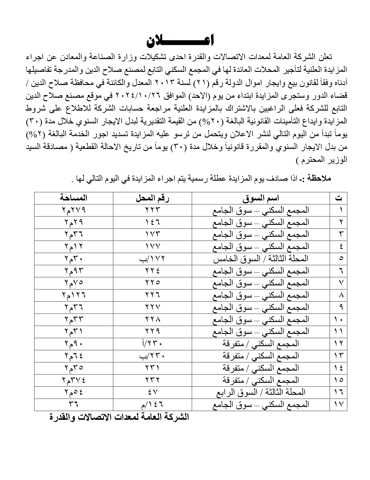اعلان مزايدة علنية للمحلات