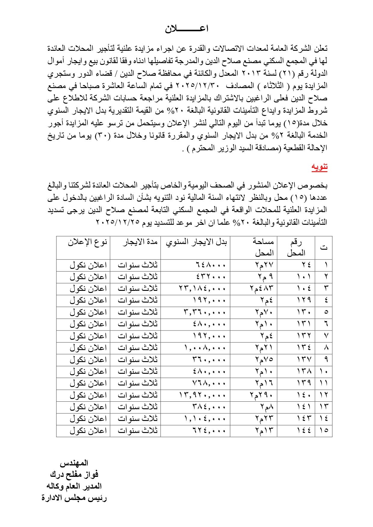 اعلان مزايدة لتاجير محلات