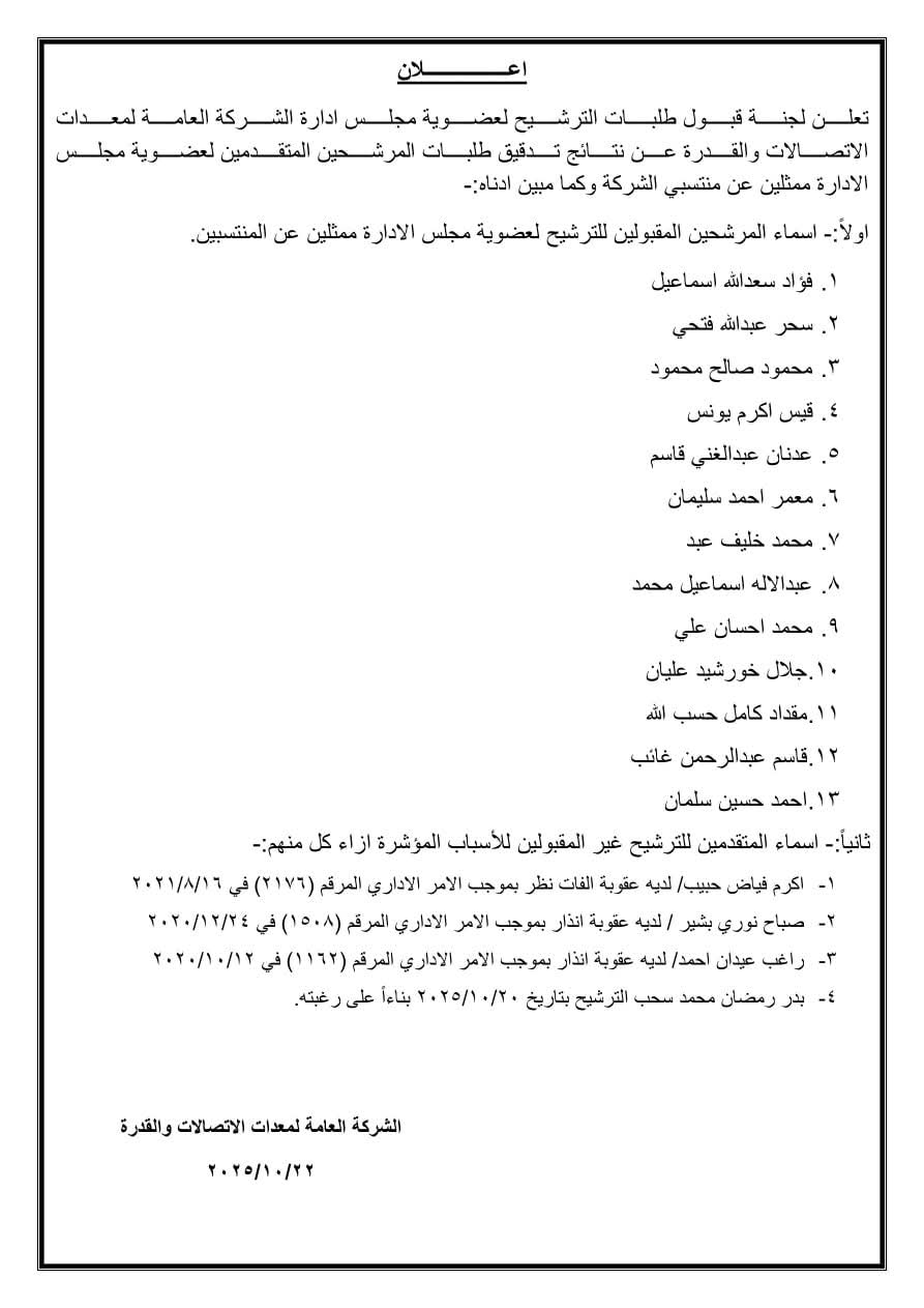 اعلان اسماء المرشحين لإنتخابات مجلس إدارة الشركة ا...