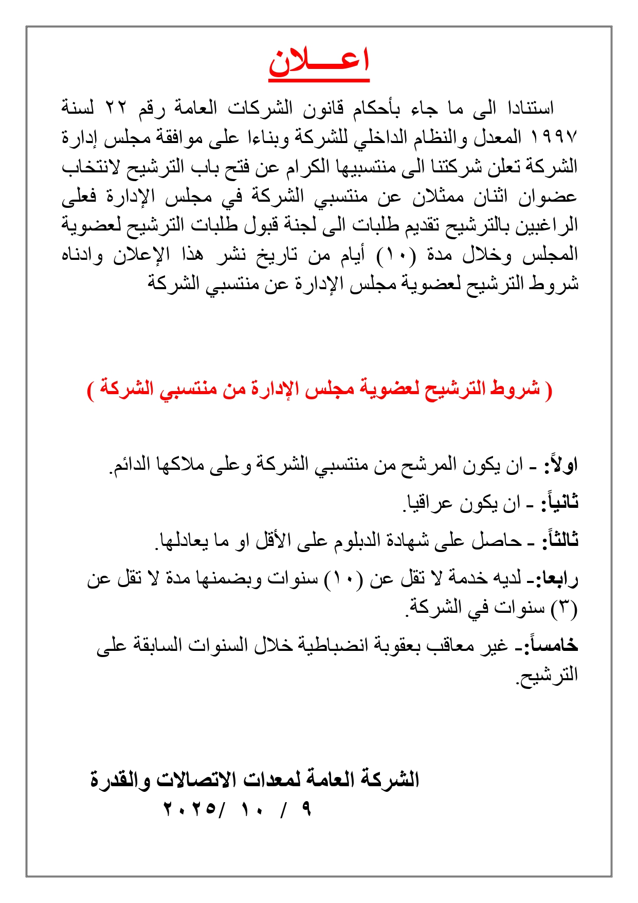 اعلان ترشيح لعضوية مجلس الادارة